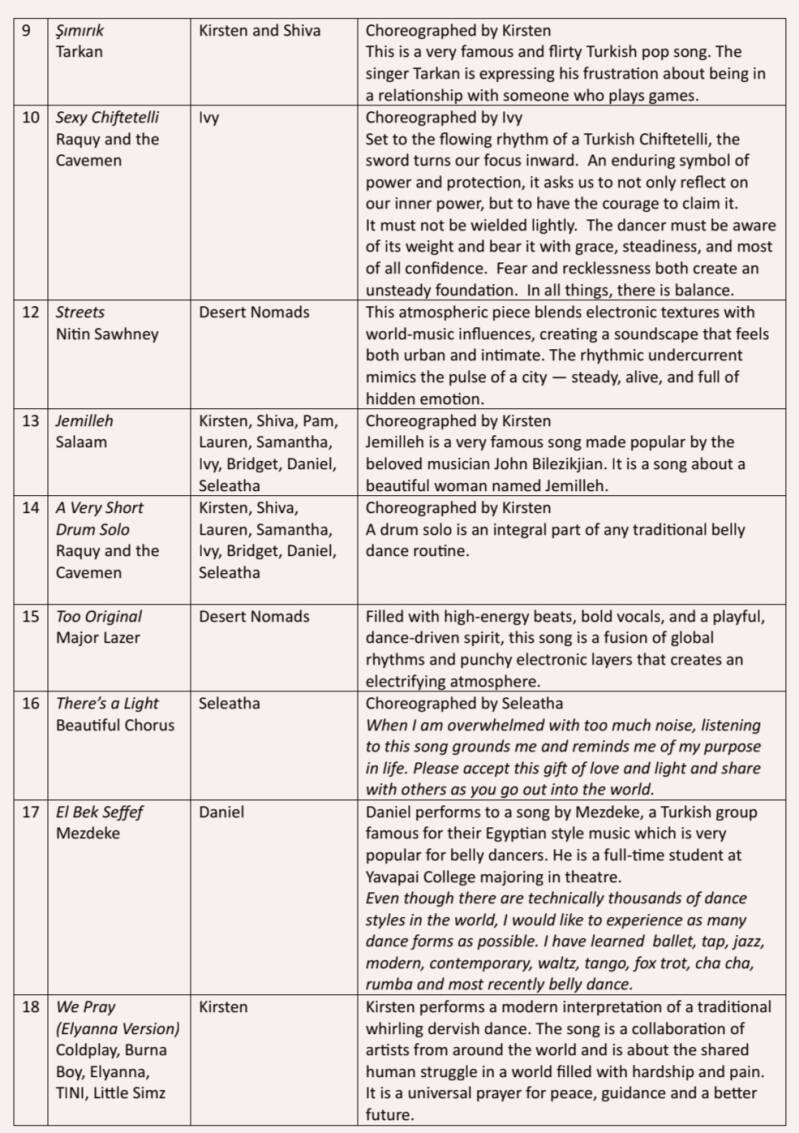 Kirsten teaches dance classes in Prescott, AZ both at the Elks and through Yavapai College Community Education. Raqs Gülistan is the name of the student/performance group of Kirsten's classes in Prescott. Today she presents her students in a tableau of group pieces and student solos.